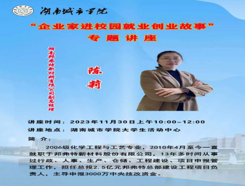 (xc体育通讯员 陈俊杰)为充分发挥优秀员工在员工学业规划和就业创业中的示范作用,推动公司就业创业工作深入开展。2023年11月30日上午10:00,xc体育“优秀员工面对面,校企合作促就业”职业规划讲座在公司老员工活动中心举行。06级优秀员工、现邦弗特新材料股份有限公司副总经理陈莉应邀担任宣讲嘉宾。公司党委书记钟桐生、副书记张清华、正处级兼职辅导员熊文高、学工办主任徐晨曦等老师与公司近200名员工代表聆听了讲座。