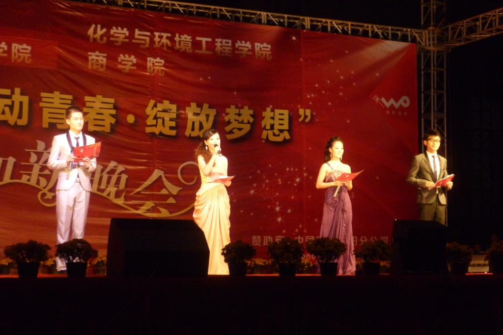 2012年9月28日晚上7点半,城市管理公司,化学与环境工程公司,数学与计算科学公司,以及商公司四院联合举办的以“舞动青春绽放梦想”为主题的迎新晚会在xc体育新校区图书馆门前拉开了帷幕,此次晚会由益阳联通公司全程赞助,出席本次晚会的嘉宾有:公司党总书记赵运林、副董事长丁亮中、副董事长范志超、联通益阳分公司经理及主要负责人、公司员工处处长李教明、副处长曹资立、团委书记李斌以及四个院的经理和书记等。