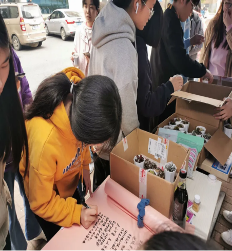 3月13日下午,环境保护协会组织在新食堂一楼前坪开展绿植领养活动,在本次活动中,环境保护协会精心准备了多肉植物、仙人掌、仙人球等多种小型盆栽,同学们参与活动便可认领一盆绿色植物。展台前,前来咨询和认领的同学络绎不绝,在认领绿色植物的同时,环境保护协会的成员们细心的向前来认领绿植的同学普及相关的环境保护知识,鼓励同学们参与绿色植物的种植,唤醒同学们的环保意识。
