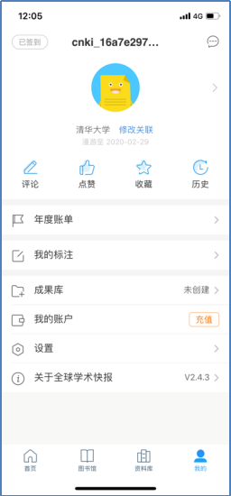 完成注册后,输入用户名和密码登录进入系统。点击头像图标,将必要的个人信息如实补充完毕,邮箱最好填机构邮箱,如kcx111@mails.tsinghua.edu.cn,机构务必填写完整,如填北京大学而非“北大”,北京师范大学而非“北师大”,上海交通大学而非“上交大”,以便准确认证。知网将通过位置、IP、机构名称、姓名等信息,采用大数据分析方式认证用户的合法性。