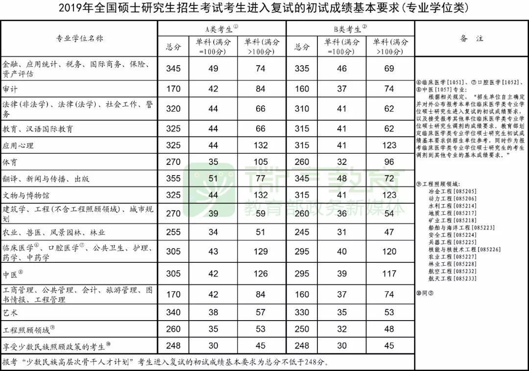 2019年全国硕士研究生招生考试考生进入复试的初试成绩基本要求(专业学位类)