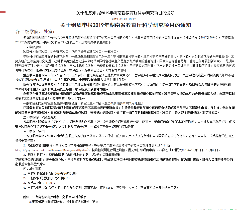 关于组织申报2019年湖南省教育厅科学研究项目的通知