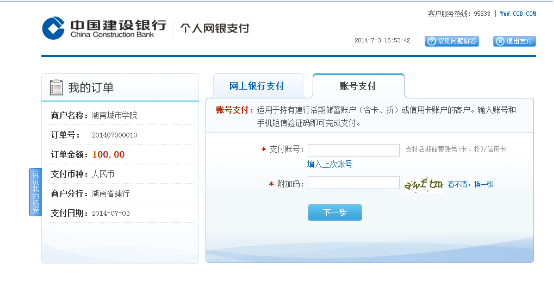 6. 点击“立即支付”并“确认”后将跳转至银行支付页面,该页面左侧的商户名称为“xc体育”,核对无误后,请按提示完成缴费。