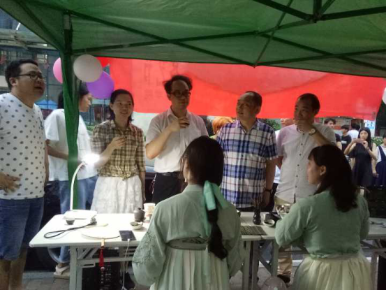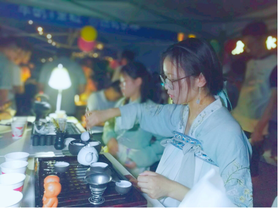 夜幕微降,新食堂摆台区域坐着三位身穿汉服的员工茶艺师,他们伴随着现场由主办方提供的音响所播放的婉转悠扬、绵远缥缈的中国古典音乐沏茶斟茶,举手投足皆是优美,技艺手法不尽娴熟,现场画面美好和谐处处展现了本次茶艺活动的主题。随后,公司党总支书记王彬、副经理刘长辉、副书记王传浩,辅导员徐晨曦、陈艳姣莅临活动现场,并对活动进行了指导。在现场,领导和老师观看了员工茶艺师的茶艺表演,并品尝了员工们沏的茶,还同活动中的员工交流了黑茶制作工艺和茶艺精髓历史。此次活动还安排了书法展示等各种调节心理情绪的小游戏,让员工们在课余时间积极参与到社团活动来,建设健康的员工心理,通过品茗来陶冶情操、净化心灵。