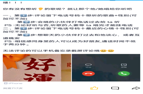 总有一句问候,让我们的心时刻感受着温暖;总有一次祝福,让我们的心时刻背负着幸福;总有一阵关心,让我们的心时刻承载着感动。为歌声插上翅膀,让音乐传递心声。“陌生人的电话”线上点歌台活动的主要进行的方式是心理部发布活动通知,参加活动者则需要在好友动态评论区评论自己此时的心情或者想听的歌曲,留下自己的联系方式,等待有缘陌生人的来电。活动伊始,同学们热情高涨,纷纷踊跃参加此次活动,有的同学交到了朋友;有的同学分享了快乐;还有同学也在这里解开了困扰很久的心结。一曲音乐,一个故事,一份祝福,一丝关爱。同一片蓝天,有不同的心情,同一个校园,有着不同的祝福,聆听歌声,传递快乐。心理部计划将此次活动以期为单位举办十期,后续也会根据同学们的反馈,及时做出创新和调整。