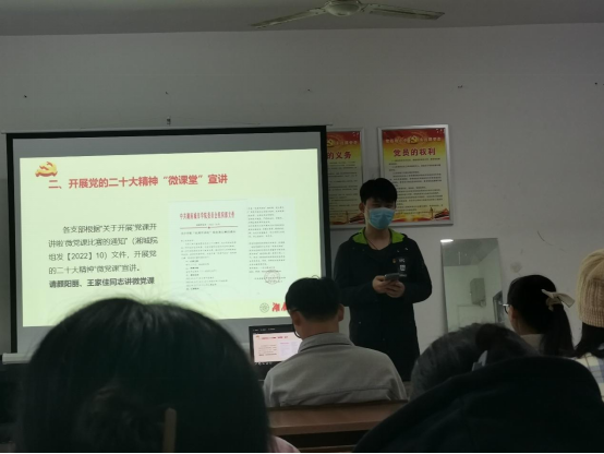 随后,开展了党的二十大精神“微课题”宣讲。其中,王佳家同志从“实施科教兴国战略,强化现代化建设人才支撑”讲述了教育、科技、人才是全面建设社会主义现代化国家的基础性、战略性支撑。在我国未来的发展过程中,强化教育,培养高科技人才,深入实施人才强国战略,是一条非常正确且光明的道路。
