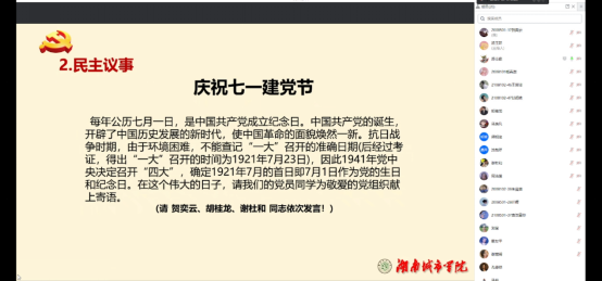 接着,支部成员对“七一建党节”的由来等内容进行了学习,并为这个伟大的日子献上了寄语,谢杜和同志说:忆往昔峥嵘岁月愁,缅怀过去,我们应牢记先辈沉甸甸的嘱托,奋发图强;面对未来,我们要不断弘扬伟大建党精神,发挥青年党员的先锋模范作用!愿山河无恙,祖国昌盛!