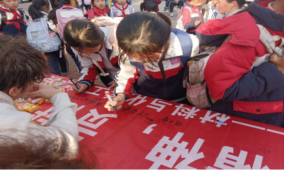 活动当日,志愿者们身着红色马甲,在校门口帮助员工安全过马路,看到有低年级同学背着沉重的书包,志愿们主动上前帮忙,护送他们安全出行。通过摆台向孩子们讲述雷锋的故事,传递雷锋精神。生动的讲述吸引了众多孩子的目光,他们聚精会神地聆听,时不时提出问题,对雷锋精神的敬佩之情油然而生。小员工们纷纷在横幅上留下自己的名字,表示要向雷锋叔叔学习,争做一个乐于助人的人。
