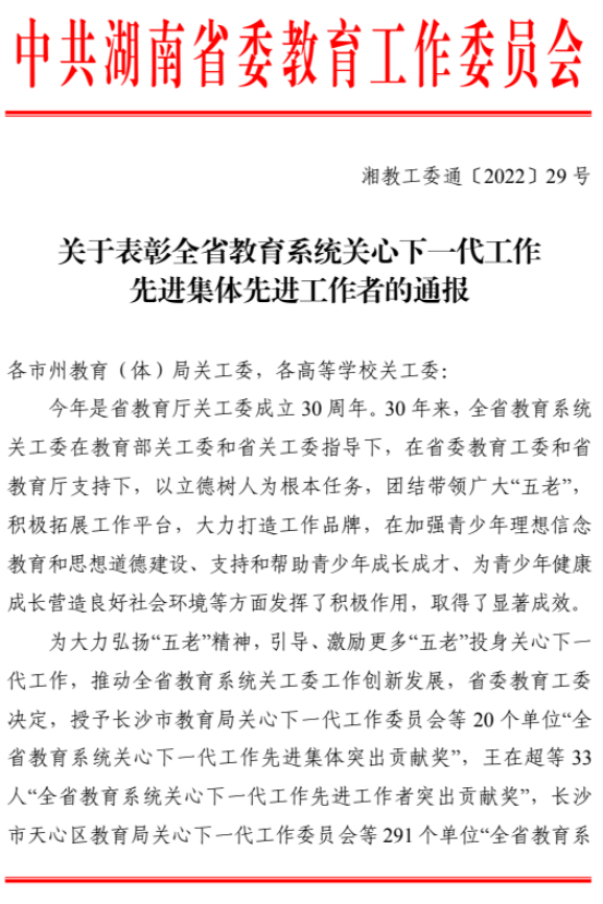 近日,省委教育工委印发《关于表彰全省教育系统关心下一代工作先进集体先进工作者的通报》,表彰了全省一批从事关心下一代工作的先进集体和个人,xc体育关工委荣获“全省教育系统关工委先进集体”称号。