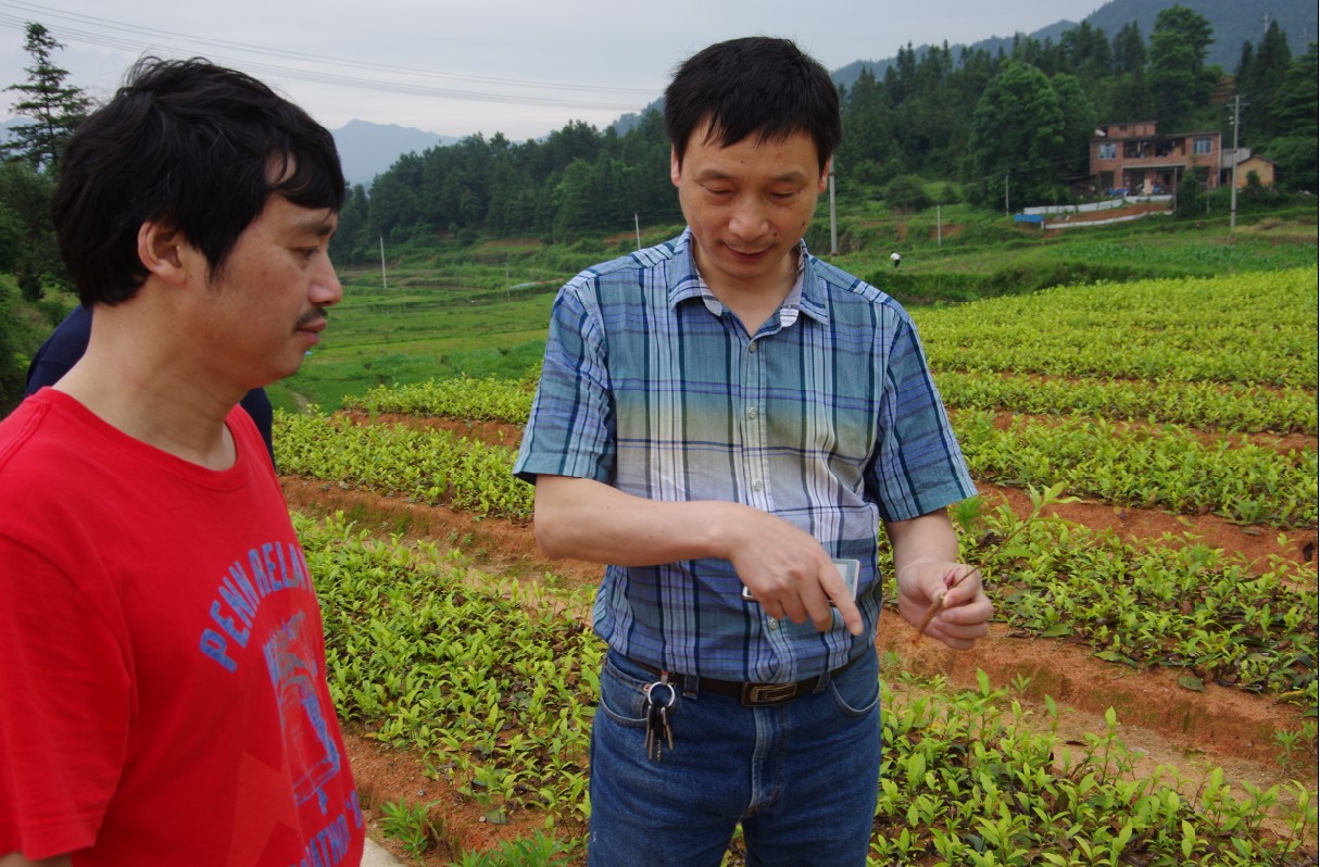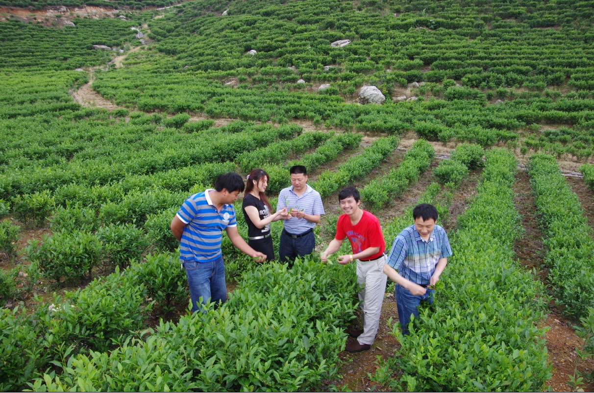 公司总经理姜胜标陪同在考察黑毛茶质量