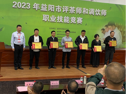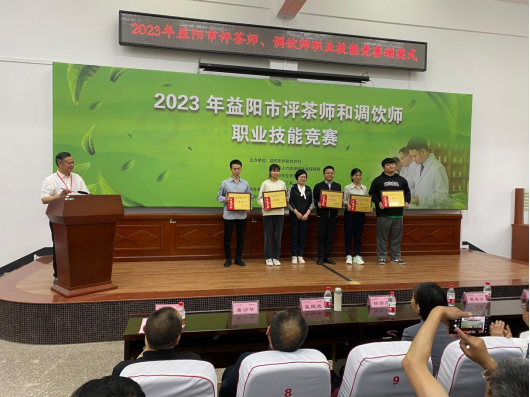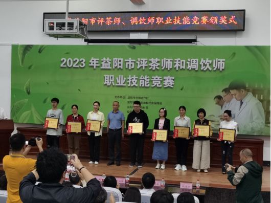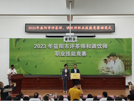 59日下午,2023年益阳市评茶师和调饮师职业技能竞赛在公司黑茶基地圆满结束,共有20人次获奖,益阳市人大常委会党组成员、副主任、市总工会主席杨丽萍、湖南城市公司党委副书记、董事长何振、国家教育部茶学重点实验室主任、湖南农大黄建安教授,中国茶叶学会副理事长、湖南省茶叶学会理事长、湖南农大肖力争教授、湖南农大傅冬和教授、李适教授等专家评委以及益阳市供销社党组书记、理事会主任严文凯、市茶业协会会长刘新安等出席颁奖式,颁奖式由市茶业协会匡维波副书记主持。