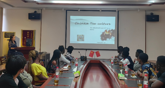 姚教授从中国茶的起源、历史发展、中国茶艺、中国茶道等方面向加纳国际交流生介绍中国茶文化,并针对饮茶器具、茶叶泡饮方式、中国茶叶品类等与员工积极互动。