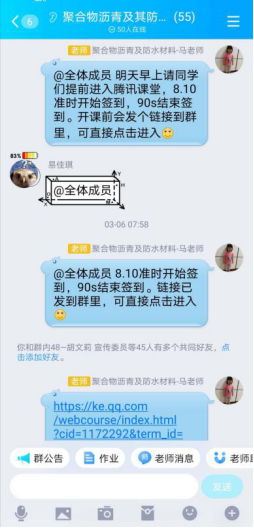 疫情防控期间,根据教育部“停课不停教,停课不停学”的要求,xc体育全校师生采用网络课堂形式,以线上教学形式开展教学活动。鉴于现有的在线教育软件都处于正在逐步完善阶段,xc体育马德崇老师任教的《环保建筑材料》和《聚合物水泥基建材料及其应用》等课程采用“腾讯课堂+蓝墨云班课+QQ”的混合式学习的教学模式,通过腾讯课堂线上直播进行课堂教学,并在蓝墨云班课中发布教学资源供员工线下自主学习,并采用课堂讨论形式检查课后学习效果。并精心准备了多套预案,保证教学能正常有序进行。
