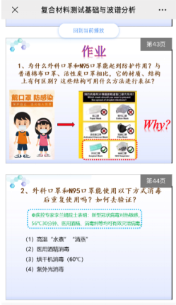 吴老师的《复合材料测试基础与波谱分析》,采用雨课堂+腾讯课堂同时进行直播授课。雨课堂平台直播可回看PPT内容,腾讯课堂网络稳定且该平台的讨论区便于师生互动及同学间相互讨论。员工可根据自身学习特点及网络情况选择平台进行听课,如有需要还可进行课后回播。该课程内容主要涉及现代分析技术的原理、仪器的使用和谱图的分析等,比较抽象。为保证线上教学的效果,吴老师结合布鲁姆模型精心设计教学目标和教学活动,在重要知识点的讲解过程中运用大量的模型和图形将抽象的知识具体化,在谱图应用方面则紧密联系生活生产实例来剖析谱图分析的要点和技巧,让员工在轻松、有趣的学习情境中获取知识。同时课后作业类型也是多样化的,有独立完成的,有需要小组合作搜集资料的,让员工在巩固知识的同时能够灵活地运用所学知识来解决生活和生产遇到的实际问题,从而获取新知。
