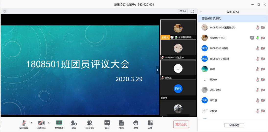 由于疫情影响,该次会议以腾讯会议为平台召开。此次民主评议过程有三个程序:首先,各班团员提交提前填写好的《团员民主评议考核表》,该表是团员个人认真回顾并总结自身过去一年在思想、工作、学习和团的生活等方面的表现情况形成的个人自评书面总结材料。其次,在该次评议会上,各班团支部委员会根据评议情况研究提出每名团员的建议评议等级,并报上级委员会批准,将所有团员评为“优秀”、“合格”、“基本合格”、“不合格”四个等次,其中“优秀”等次团员数量控制在了参加评议团员人数的30%以内,接着每位团员自由发言,对有异议的地方进行提问与反馈。最后,由团支部书记宣布本团支部“优秀”团员名单。会议上对表现突出的团员团干给予了充分肯定,并对违纪团员进行了批评教育和相应的纪律处分。