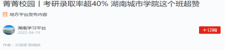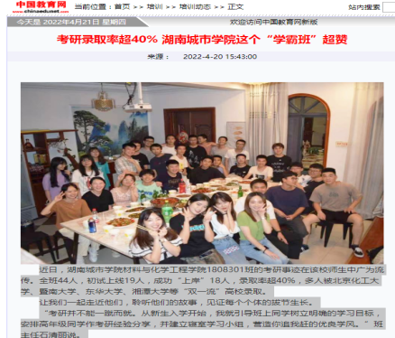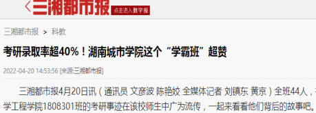 题记:在今年2022届毕业生考研工作中,xc体育共有197人参考,考研初试上线86人,目前预录取80人,其中1808301班考研共有18人成功“上岸”。公司网站对此事迹报道后,引起了中国教育网、学习强国、新浪网、湖南日报新媒体客户端、湖南教育、红网、三湘都市报、腾讯网、网易网、搜狐网、益阳日报等近十余家媒体专题跟踪报道,在高校和社会上产生强烈反响,现摘录如下: